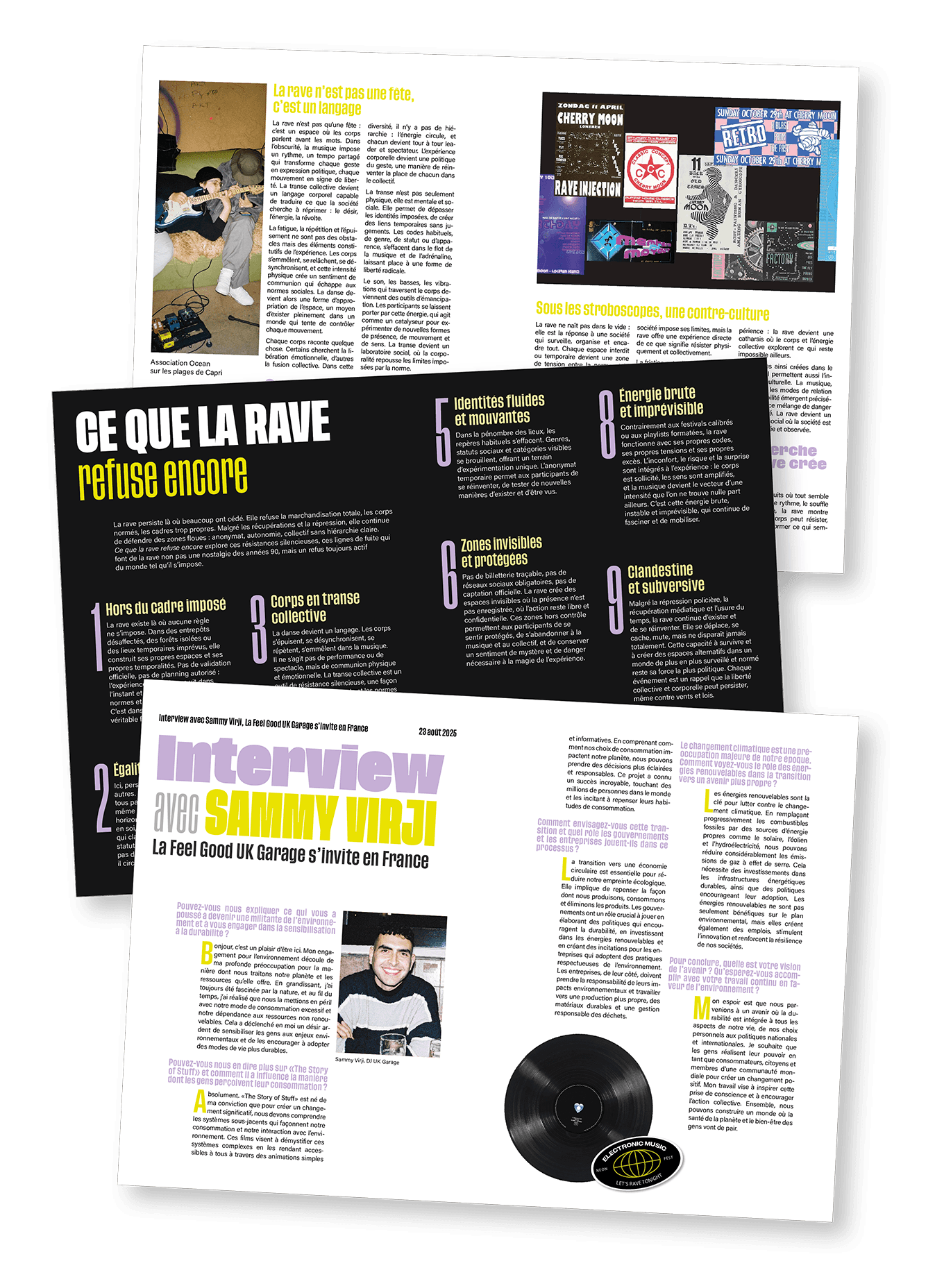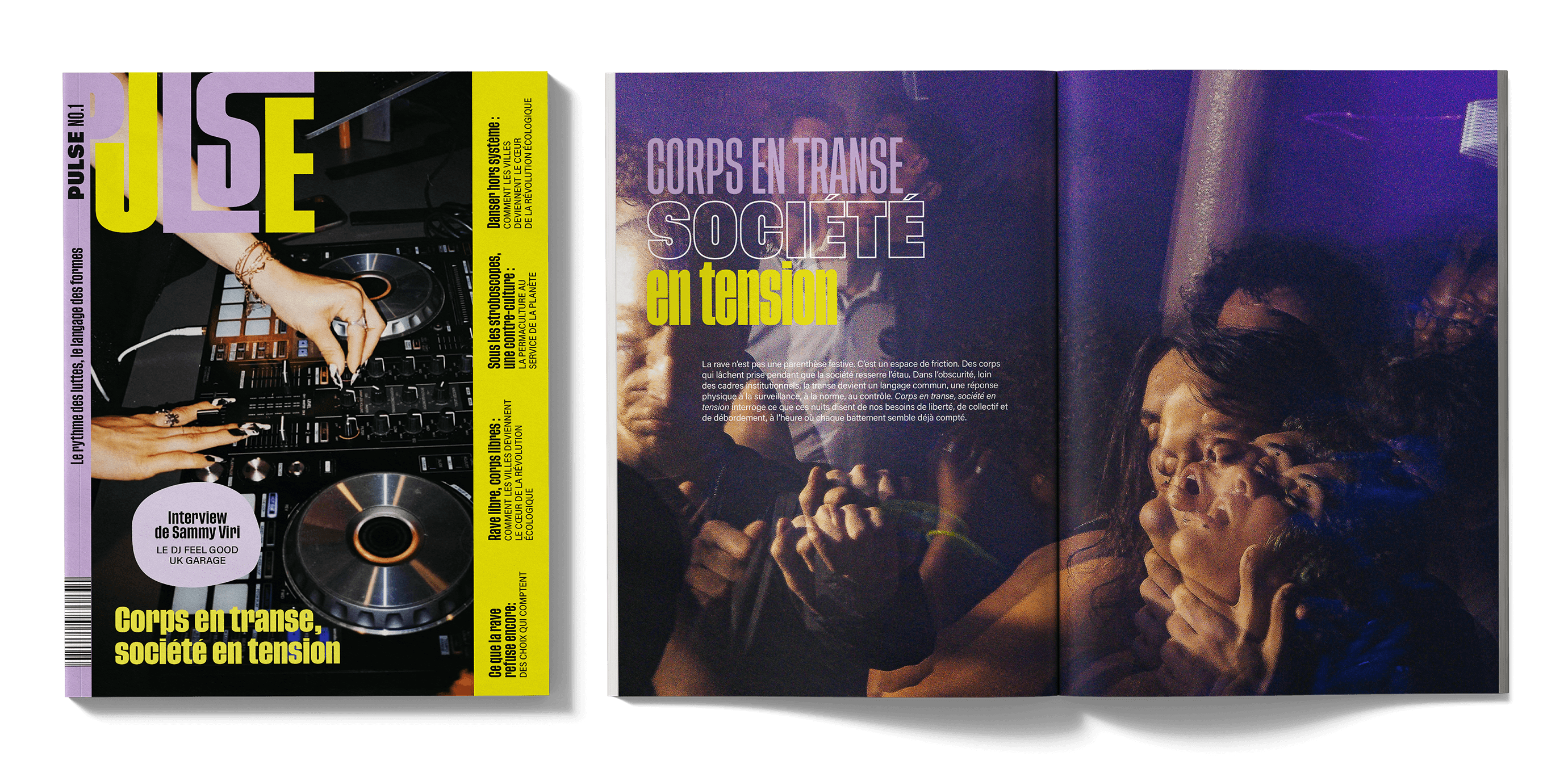 Direction artistique de la couverture et de la maquette intérieure du magazine indépendant Pulse. Le magazine explore la contre-culture des raves et de la musique électronique à travers un univers graphique impactant et engagé, directement inspiré des codes visuels de la teuf et de sa luminosité. Pensé comme un manifeste culturel, Pulse s’adresse à un public averti et revendique une identité éditoriale forte et sans compromis.